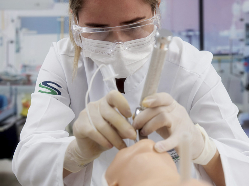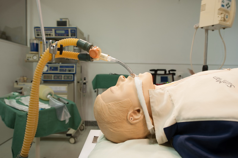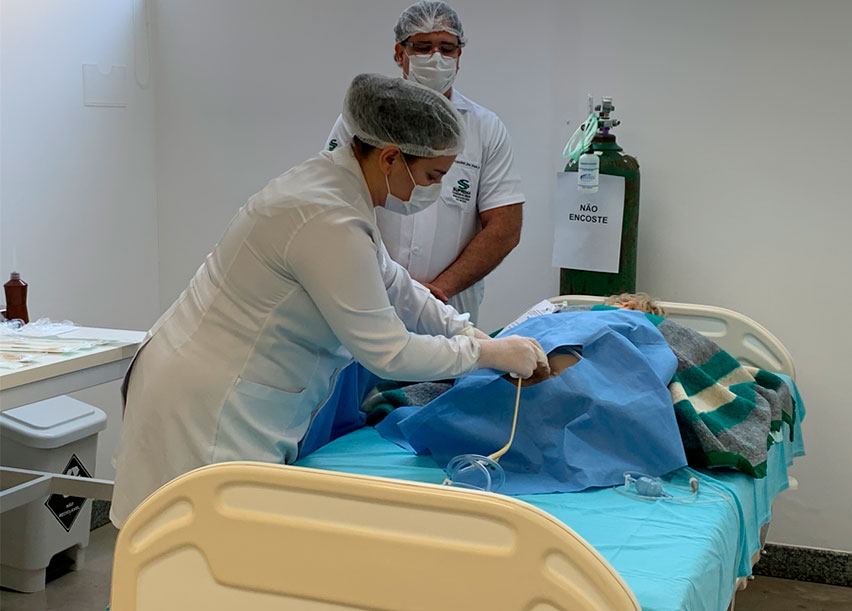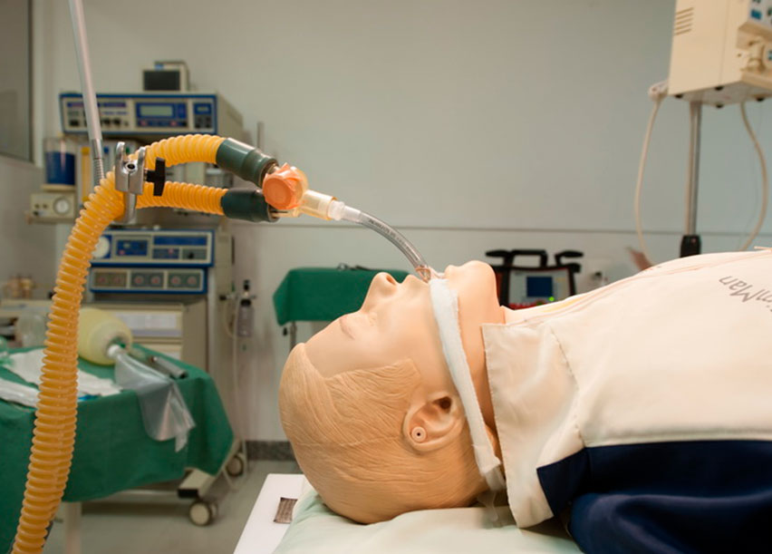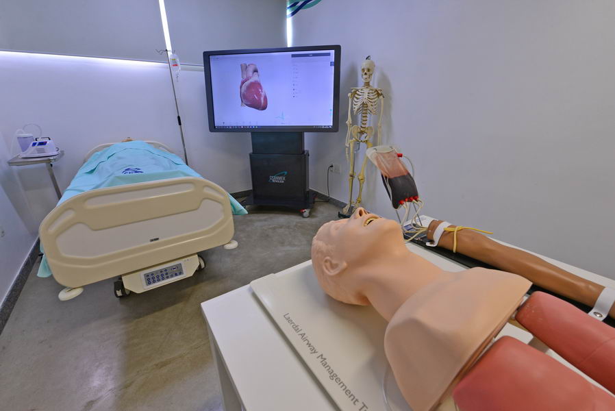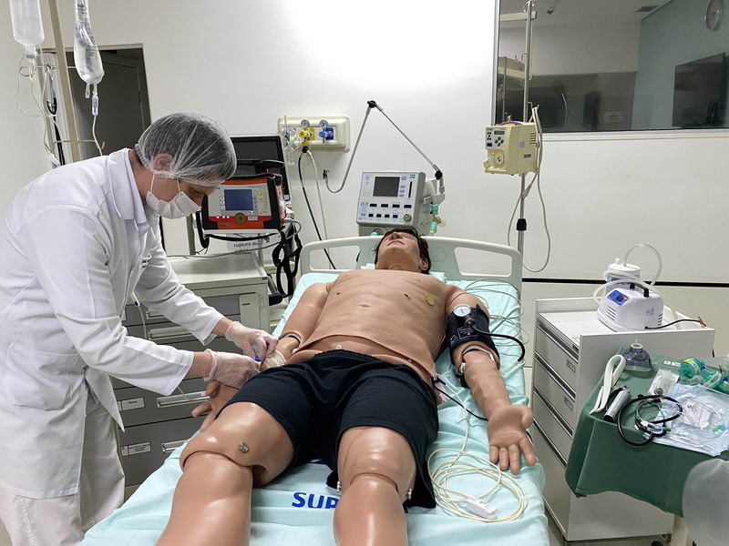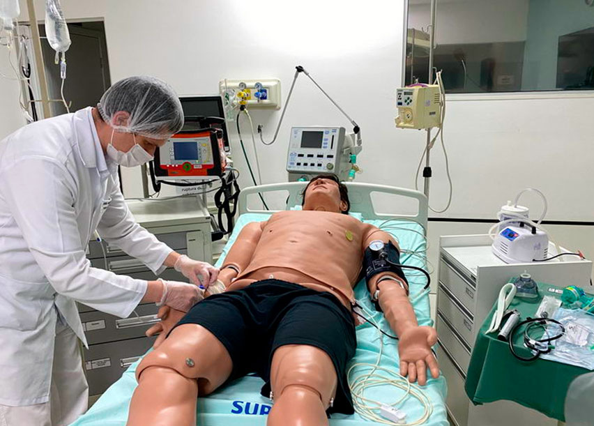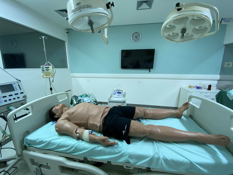 Um simulador de paciente adulto, que permite a construção de cenários práticos em ambiente dinâmico e dotado de interatividade, aproximando-se dos cenários hospitalares e ambulatoriais reais e oferecendo ao estudante a oportunidade de desenvolver atitude de respeito, concentração e empatia.